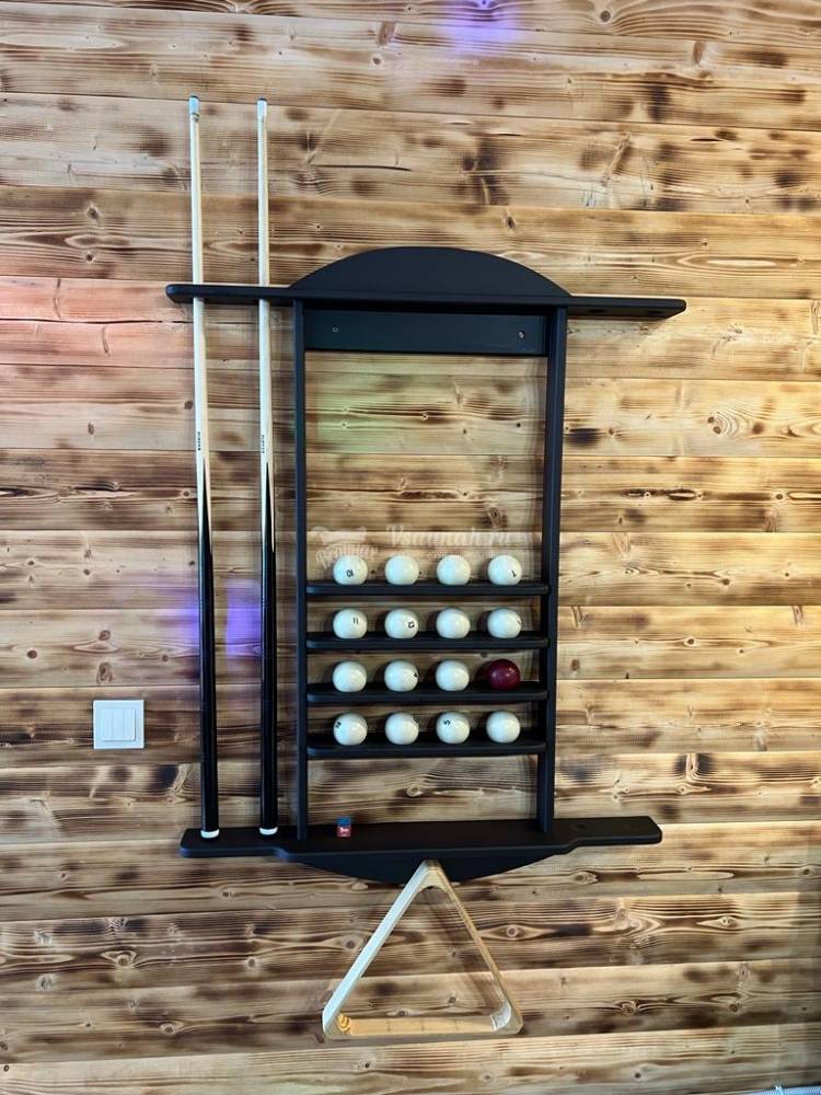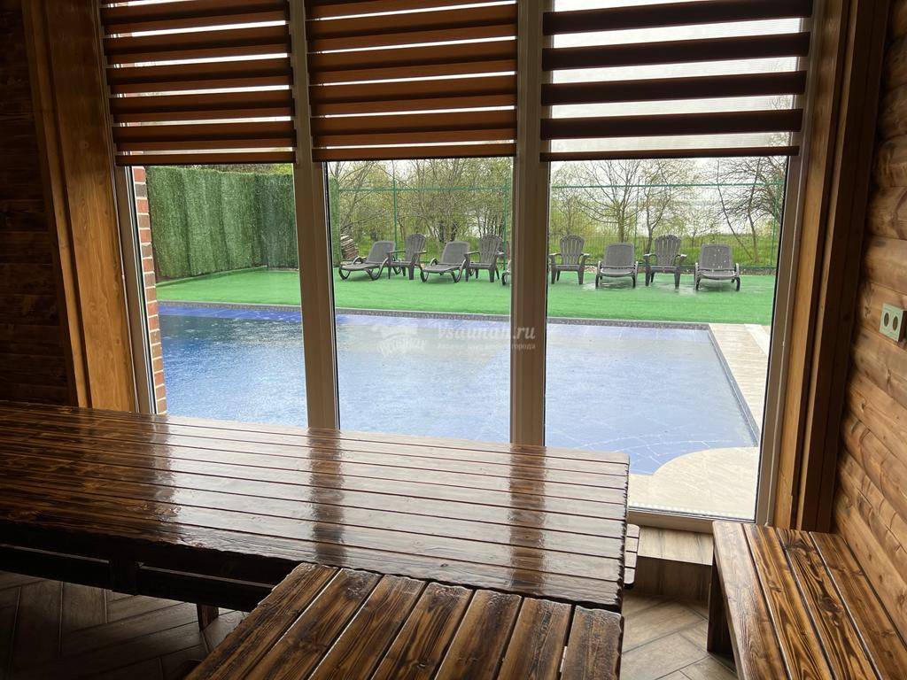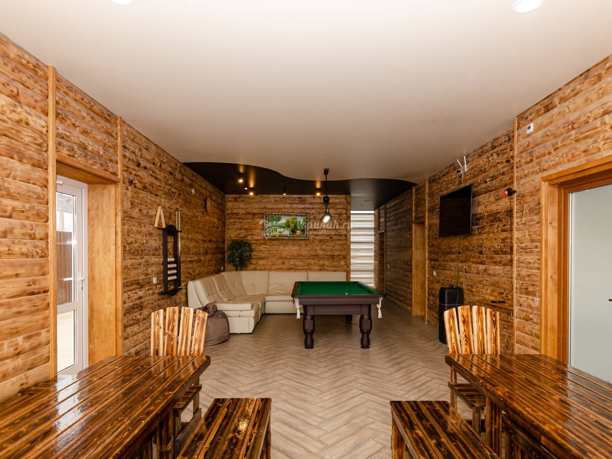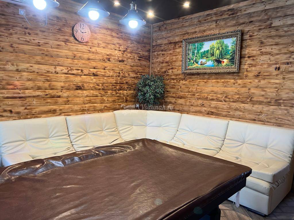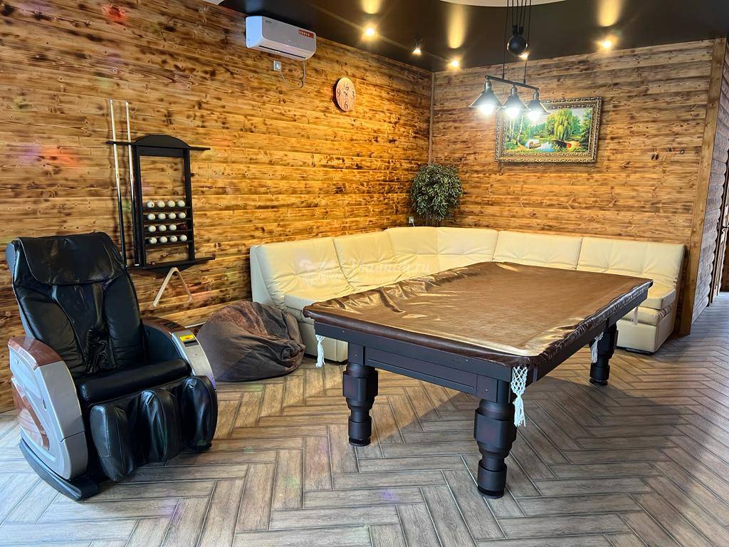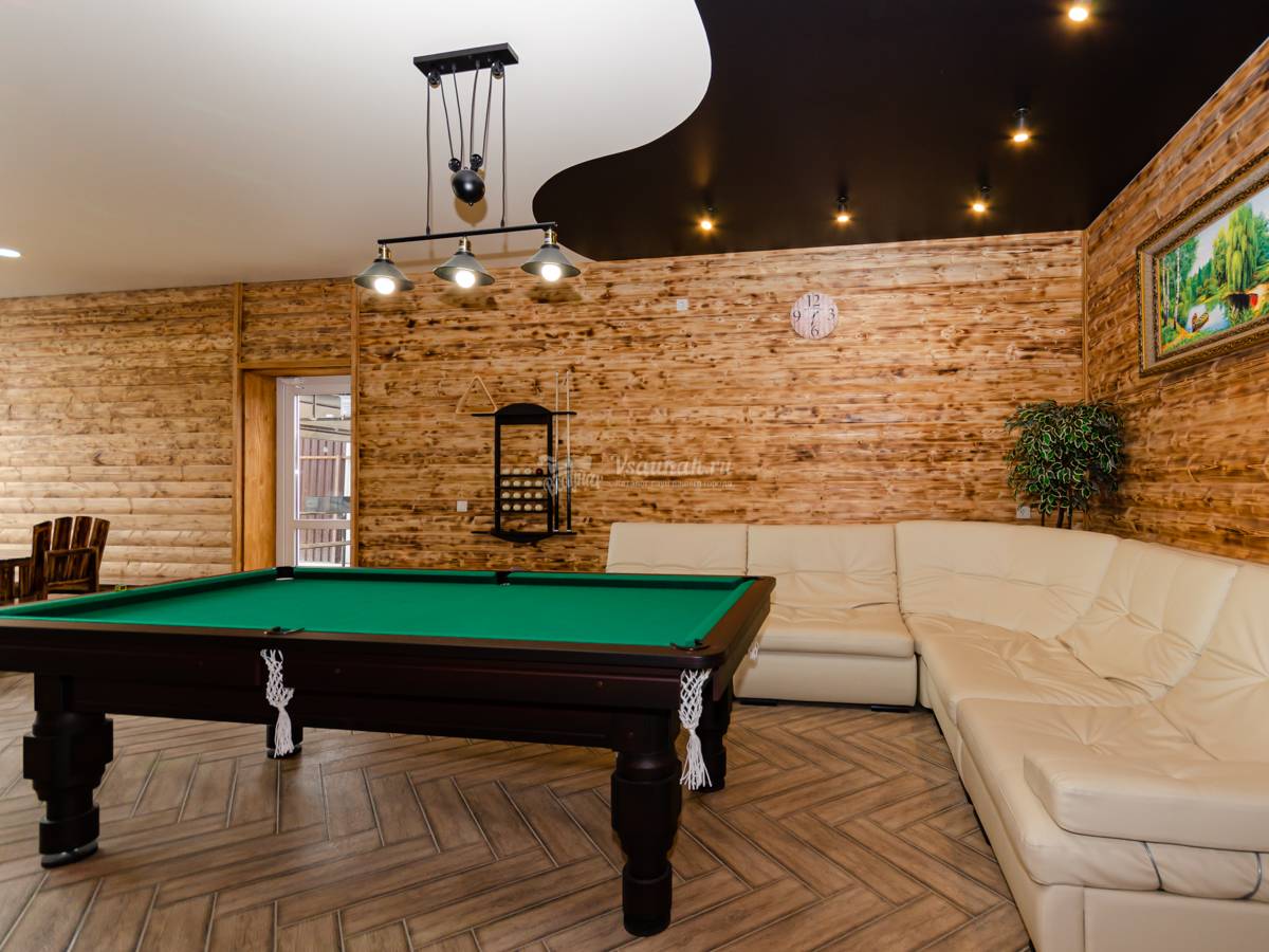 Интерьер, мебель, бильярд, всё новое, чистое;) Парилка, веники, были готовы к нашему приезду. Температура сауны нас устроила, париться было комфортно. Бассейн чистый, но прохладный. Самое то чтобы нырнуть после пара.
